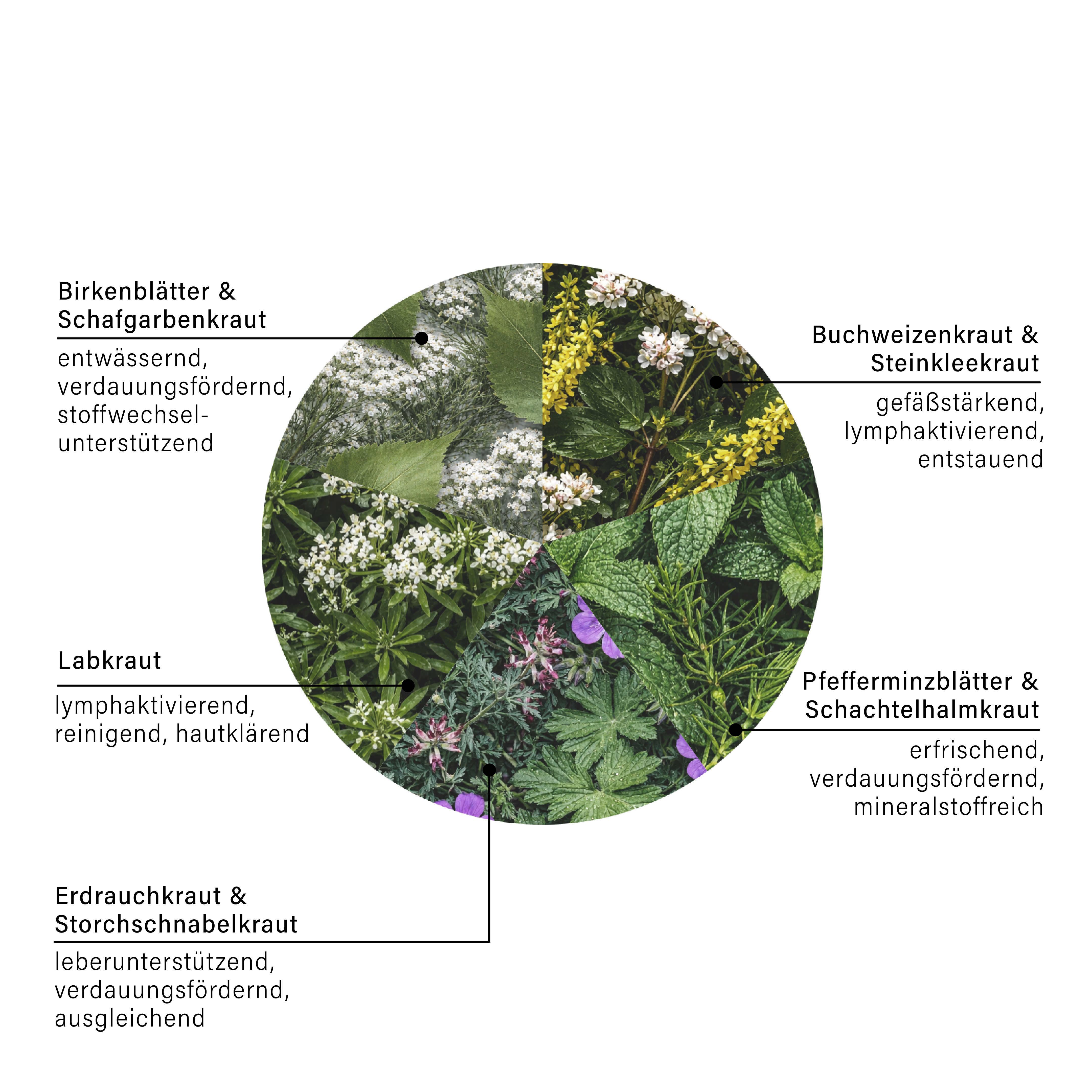 Birkenblätter, Schachtelhalm und Pfefferminze fördern die sanfte Ausleitung über die Nieren und wirken hautklärend. Steinklee, Labkraut und Schafgarbe unterstützen gezielt den Lymphfluss und wirken abschwellend. Buchweizenkraut, Storchenschnabel und Erdrauch liefern antioxidative, kapillarstärkende und hormonell regulierende Impulse.